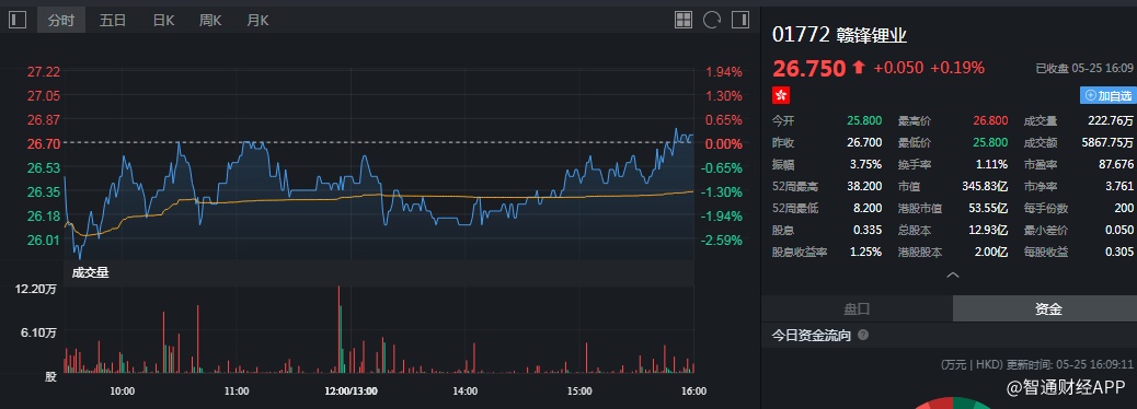 截至今日收盘,赣锋锂业涨0.19%,报26.75港元。