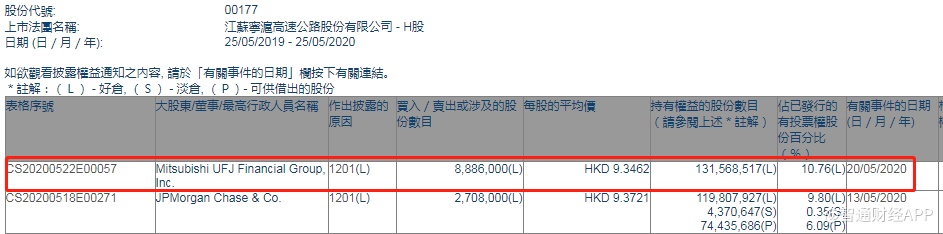 智通财经APP获悉,联交所最新资料显示,5月15日,Mitsubishi UFJ Financial Group, Inc.减持江苏宁沪高速公路(00177)888.6万股,每股作价9.3462港元,总金额约为8305.03万港元。减持后最新持股数目约为1.32亿股,最新持股比例为10.76%。
