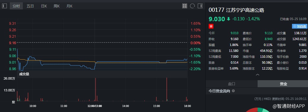 截至今日收盘,江苏宁沪高速公路跌1.42%,报9.03港元。
