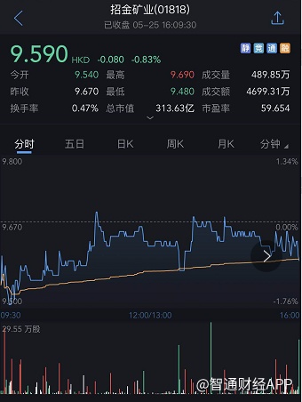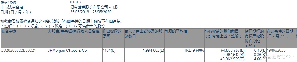智通财经APP获悉,联交所最新资料显示,5月19日,摩根大通增持招金矿业(01818)199.4万股,每股作价9.6885港元,总金额约为1931.89万港元。智通财经APP获悉,增持后最新持股数目约为6400.88万股,最新持股比例为6.10%。