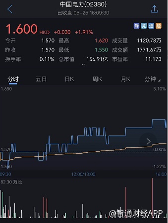 截至今日收盘,中国电力涨1.91%,报1.6港元。