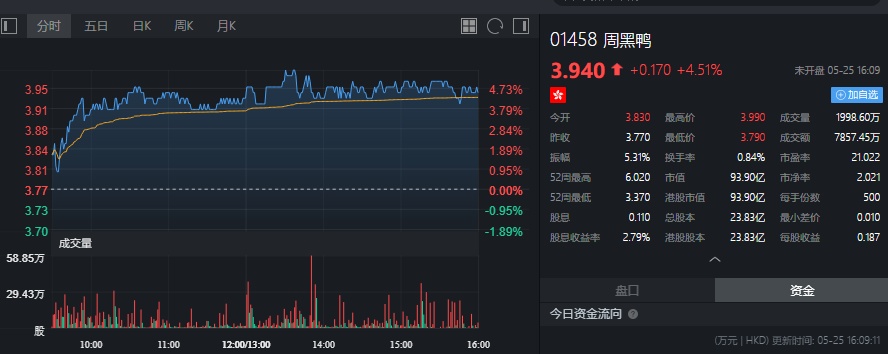 截至昨日收盘,周黑鸭涨4.51%,报3.94港元。