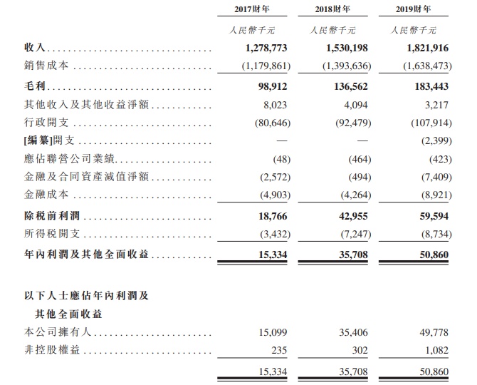 企业业务和经营规模多年保持稳定增长。其总收入从2017财年的约人民币12.79亿元增加约人民币5.43亿元至2019财年的约人民币18.22亿元,复合年增长率为19.4%。该企业年内利润及其他全面收益亦录得大幅增长,从2017财年的约人民币1533.4万元增加约人民币3552.6万元至2019财年的约人民币5086万元,复合年增长率约为82.4%。