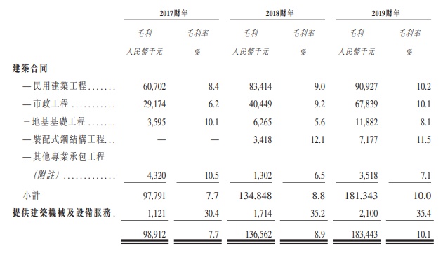 就该企业的民用建筑工程及市政工程部分,于2017财年,该企业的毛利率分别约为 8.4%及6.2%。于2018财年,其毛利率分别增加至约9.0%和9.2%,并于2019财年分别进一步增加至约10.2%和10.1%。2018财年和2019财年毛利率出现增加的主要原因主要是由于根据2018年4月4日颁布的优惠中国说法调整,适用于任何纳税人的应税增值税工程施工服务的增值税税率从11%调整为10%,自2019年4月1日起进一步下调至9.0%。