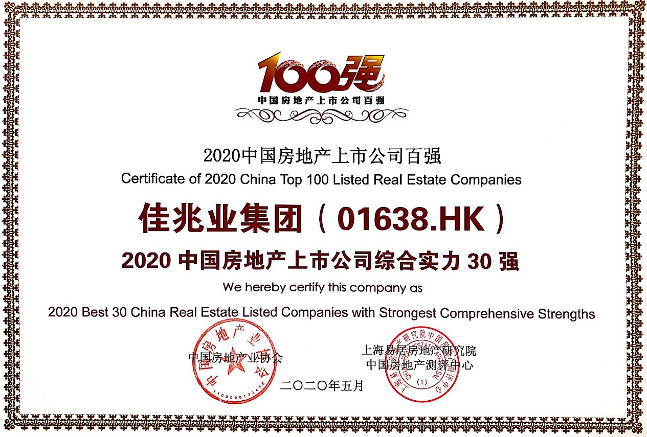 5月26日,由中国房地产业协会、上海易居房地产研究院中国房地产测评中心联合主办的“2020中国房地产上市公司测评成果发布会”在上海举办。得益于集团稳步增长的综合实力及突出的财务表现,佳兆业集团(01638)荣获“2020中国房地产上市公司综合实力”27强,再获权威机构认可。