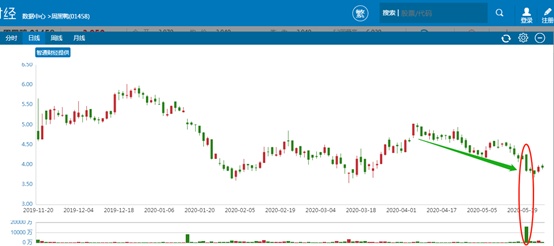 智通财经APP了解到,作为国内三大休闲卤制品巨头之一的周黑鸭,自4月7日开始股价便跌跌不休,5月20日开市之前,周黑鸭更是有2宗大手成交,以较前一日收市价低8.2%的3.8港元每股价格,成交近1.02亿股,涉及总资金近3.88亿港元。开盘之后公司股价从2.7%的涨幅直线跳水至-6%跌幅左右,之后继续震荡下行,收盘跌幅定格在了-7%,当天共计6亿多资金成交近1.58亿股,量能较前一个交易日放大近40倍,刷新了周黑鸭上市以来单日最大成交量的记录。