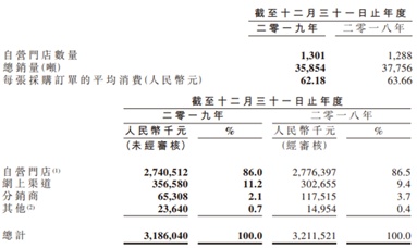 对应到收入端,公司2019年营收占绝对比重的自营门店贡献27.41亿元,同比下滑1.3%,网上渠道收入贡献同比增长17.8%至3.57亿元,分销商渠道则同比大幅下滑44.4%至6530.8万元,加上2364万元的其他收入,周黑鸭2019年营收总规模为31.86亿元,同比下滑0.8%。