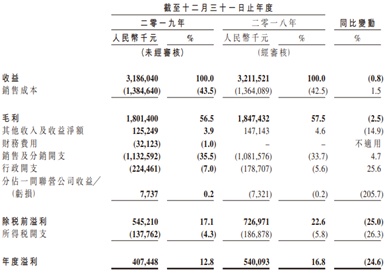 而在利润端,毛利率下滑叠加费用率上升,利润总额录得大幅下滑。智通财经APP了解到,营收规模下滑的基础上,周黑鸭还因为原材料采购单价增加、新加工工厂投产后折旧增加以及劳工成本总体上涨,销售成本同比增长1.5%至13.85亿元,导致毛利率同比下滑1个百分点至56.5%,毛利总额同比下滑2.5%至18.01亿元。同时,由于门店网络扩张有关的门店租金、销售人员薪金福利以及地域扩张产生的运输开支均有所增加,公司销售及分销开支也同比增长4.7%至11.33亿元,再加上2018年下半年和2019年上半年开始运营湖北一期加工工厂和广东加工工厂,以及行政员工成本增长,公司行政开支也同比大幅增长25.6%至2.24亿元,最终导致公司全年净利润同比大幅下滑24.6%至4.07亿元,净利率由去年同期的16.8%进一步下滑至12.8%。