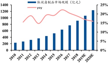 市场规模增长叠加行业集中度提升空间,卤制品龙头增长空间仍非常可观。智通财经APP了解到,2020年国内休闲食品市场规模将达到1.3万亿,其中休闲卤制品市场规模将达到1235亿元,休闲卤制品市场规模由2010年的232亿元增长至2018年的911亿元,年均复合增长率高达18.65%,增速明显高于其他品类。同时,由于食品安全问题日益严峻,很多小手工作坊式生产企业无法满足相关食品安全要求相继退出,行业逐步向头部聚集,行业的CR5从2009年5.45%提升至2019年20.20%。目前行业CR3为15.70%,前三大企业绝味食品、周黑鸭、煌上煌市占率分别为8.5%、4.6%、2.6%,竞争格局依然十分分散,仍有80%以上的企业处于小规模、作坊式、手工或半机械加工的落后状态,行业集中度仍有很大的提升空间。