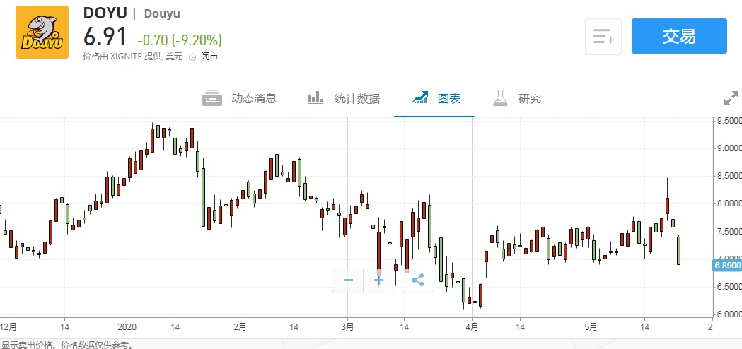 智通财经APP获悉,5月26日,斗鱼(DOYU.US)公布一季度财报超预期,盘前股价大涨,截止北京时间16:35,涨14.33%,报7.90美元。