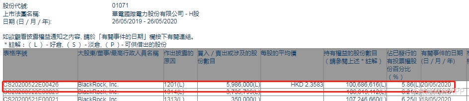 智通财经APP获悉,联交所最新资料显示,5月20日,贝莱德减持华电国际电力股份(01071)598.6万股,每股作价2.3583港元,总金额约为1411.68万港元。智通财经APP获悉,减持后最新持股数目约为1.01亿股,最新持股比例为5.86%。