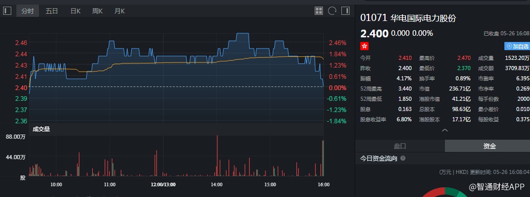 截至今日收盘,华电国际电力股份无涨跌,报2.40港元。