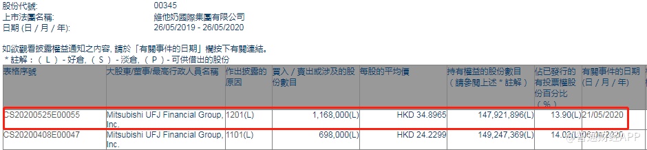 智通财经APP获悉,联交所最新资料显示,5月21日,Mitsubishi UFJ Financial Group, Inc.减持维他奶(00345)116.8万股,每股作价34.8965港元,总金额约为4075.91万港元。智通财经APP获悉,减持后最新持股数目约为1.48亿股,最新持股比例为13.90%。