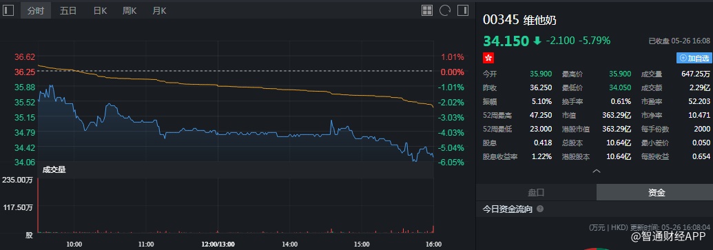 截至今日收盘,维他奶跌5.79%,报34.15港元。