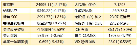 1、周二,欧洲多个国家加快解除封锁措施,加上疫苗研发传出利好消息,刺激道指盘中重返25000点和标普500指数开盘收复3000点,美股集体高收。截至收盘,标普500指数涨36.30点,涨幅1.23%,报2991.77点;纳指涨15.60点,涨幅0.17%,报9340.22点;道指涨530.00点,涨幅2.17%,报24995.11点。港股ADR指数未能跟涨,按比例计算,收报23157点,跌226.72点或0.98%。