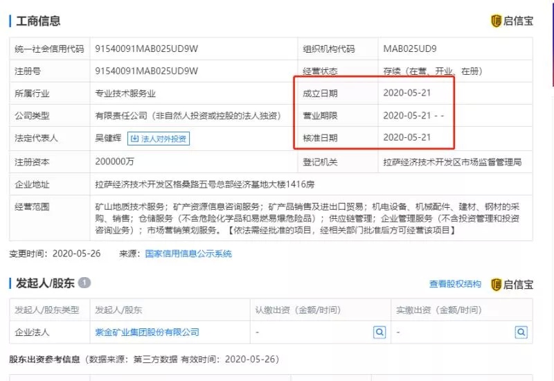 紫金矿业(02899)于5月21日在拉萨注册西藏紫金实业有限公司,认缴出资金额为20亿元人民币,持股比例为100%。这距离市场盛传的收购藏格投资及合作方所持巨龙铜业部分股权的成交又近了一步。