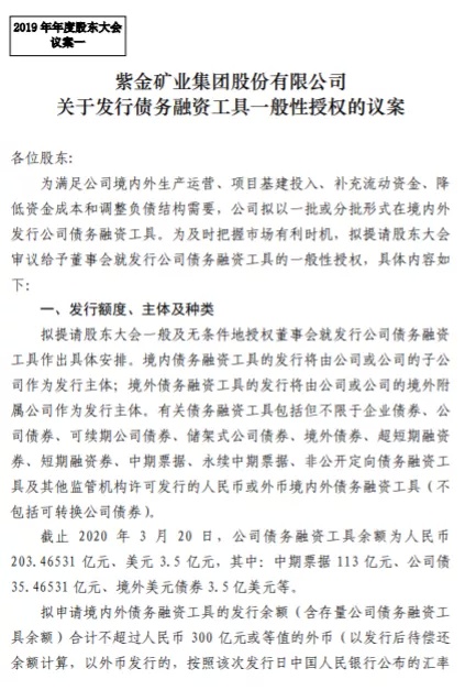 5月21日,就在注册成立西藏公司的同一天,紫金矿业宣布了将于6月12日召开股东大会,第一项审议议案就是发行债务融资工具,拟申请的境内外债务融资工具发行余额合计不超过300亿元人民币,用于项目投资等用途。