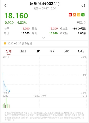 智通财经APP获悉,阿里健康(00241)将于今日发布年度业绩,市场普遍预期2020财年营收同比增长将放缓至77.7%至90.58亿元,而阿里健康此前连续三个财年营收增速保持在三位数以上。公司股价绩前走弱,截至发稿,跌4.82%,报18.16港元,成交额1.63亿港元。