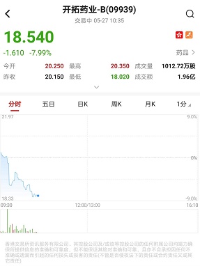 智通财经APP获悉,次新股开拓药业-B(09939)盘中以18.02港元,刷新上市新低,较发售价20.15港元低逾10%,振幅达11.56%,截至10时35分,跌7.99%,报价18.54港元,成交额1.96亿。
