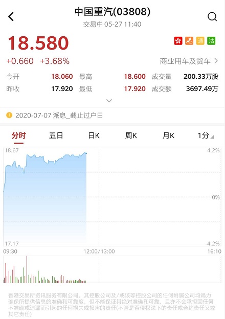智通财经APP获悉,中金发研报指,由于公司高端汕德卡车型顺利放量,更高的单车净利润有望给公司带来额外的利润弹性,该行维持中国重汽(03808)“跑赢行业”评级,上调目标价23.5%至21港元。截至发稿,中国重汽涨3.68%,报18.58港元,成交额3731.9万港元。