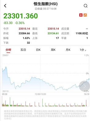 智通财经APP获悉,恒指早盘高开130.48点或0.56%,报23515.14点。截至收盘,恒生指数跌83.3点或0.36%,报23301.36点,全日成交额达1108.82亿。国企指数跌0.29%,报9567.43点,红筹指数跌0.61%,报3673.02点。