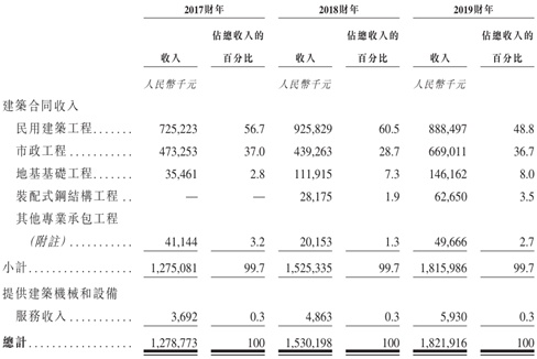 民用建筑工程、市政工程业务接连发力,中天建设营收规模录得连续增长。智通财经APP了解到,公司绝大部分收入来源于建筑合同收入,还有一小部分提供建筑机械和设备的服务收入,2017-2019年,公司分别录得12.79亿元人民币(单位下同)、15.3亿元和18.22亿元的营业收入。其中2018年营收增长主要来源于民用建筑工程同比增长27.7%至9.26亿元,同时地基基础工程营收同比增长2.16倍至1.12亿元,抵消市政工程和其它专业承包工程业务下滑,使得2018年营收总额同比增长19.6%至15.3亿元。2019年,中天民用建筑工程转入小幅下滑,之前下滑的市政工程营收实现了52.3%的同比增长至6.69亿元,再加上地基基础工程、装配式钢结构工程和其它专业承包工程,分别录得30.6%、122.4%、146.4%同比增长至1.46亿元、6265万元和4966.6万元,公司2019年营收规模再度实现19.1%同比增长至18.22亿元。