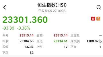 智通财经APP获悉,恒生指数开盘涨0.56%,全天震荡下挫。截至收盘,恒生指数跌83.3点或0.36%,报23301.36点,全日成交额达1108.82亿。国企指数跌0.29%,报9567.43点,红筹指数跌0.61%,报3673.02点。