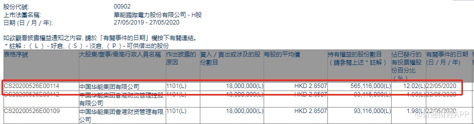 智通财经APP获悉,联交所最新资料显示,5月22日,中国华能集团有限公司增持华能国际电力股份(00902)1800万股,每股作价2.8507港元,总金额为5131.26万港元。智通财经APP获悉,增持后最新持股数目约为5.65亿股,最新持股比例为12.02%。