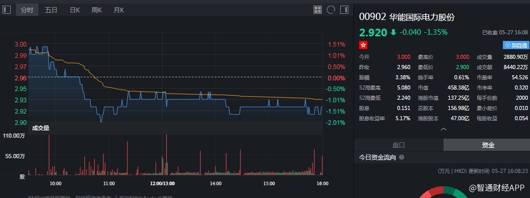 截至今日收盘,华能国际电力股份跌1.35%,报2.92港元。