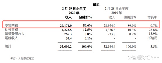 滔搏的经营模式分为零售和批发,不过作为零售龙头,其零售业务收入占据主要地位。2020财年零售业务收入达到292亿元,同比增长0.7%,收入占比86.6%,比上一财年减少2.4个百分点;批发业务收入42亿,同比增长25.8%,收入占比12.5%,同比提升2.2个百分点。