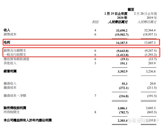 智通财经APP观察到,2020财年滔搏毛利润141.9亿元,同比增长4.4%,毛利率42.1%,同比增加0.3个百分点;同期销售和分销费用比为28.6%,同比增加0.2个百分点,行政开支费用比4.19%,同比增加0.22个百分点;而净利率为6.84%,与上一年基本持平。