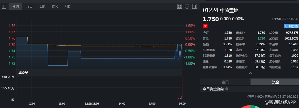 截至今日收盘,中渝置地无涨跌,报1.75港元。