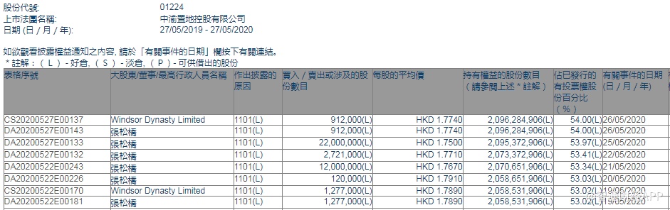 智通财经APP获悉,联交所最新资料显示,5月19-26日,主席兼执行董事张松桥连续6个交易日分别增持中渝置地(01224)127.7万、12万、1200万、272.1万、2200万、91.2万股,每股作价分别为1.789港元、1.791港元、1.767港元、1.771港元、1.75港元及1.774港元,总金额约为6864.03万港元。智通财经APP获悉,增持后最新持股数目为20.96亿股,最新持股比例为54%。