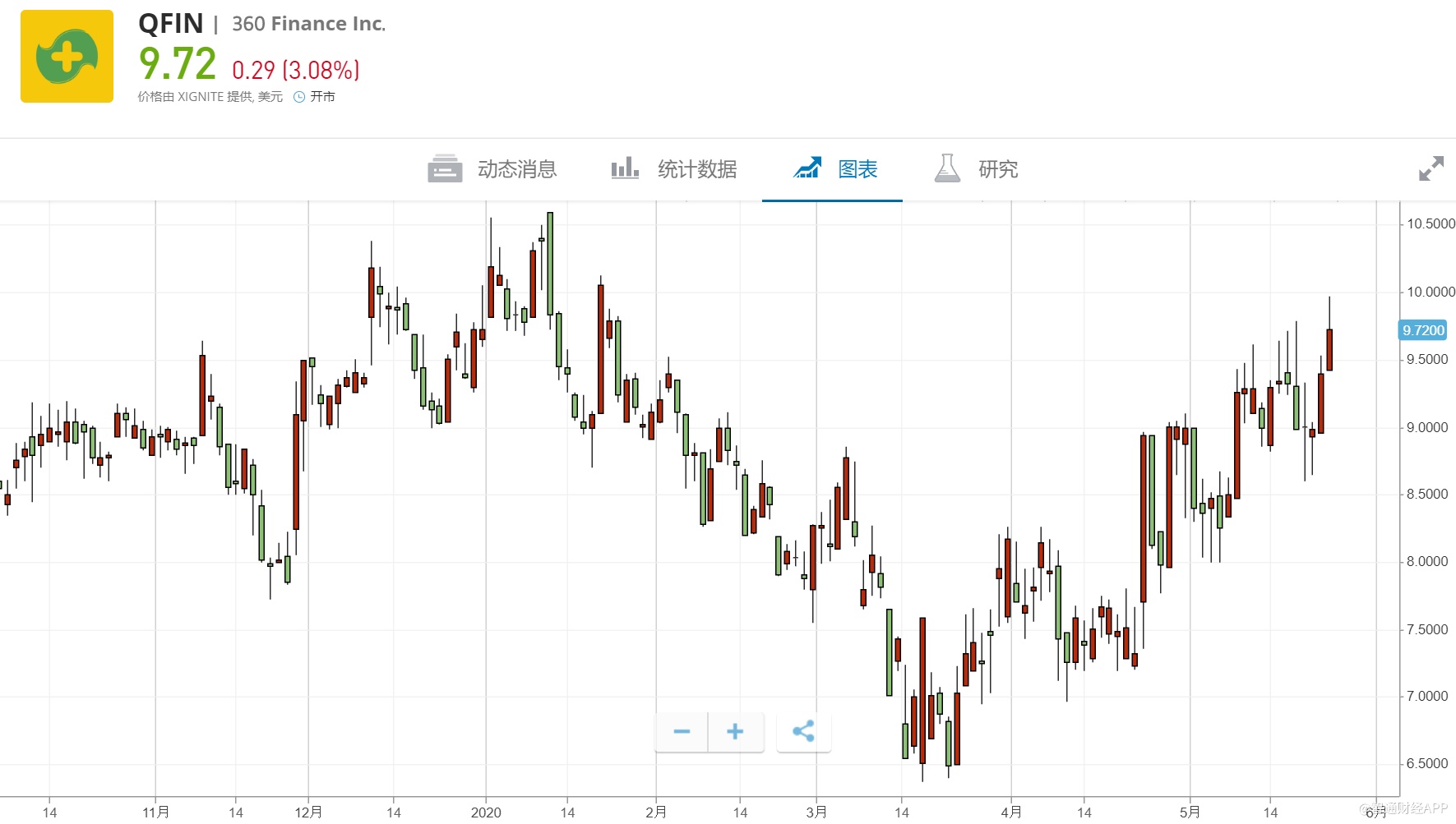 智通财经APP获悉,5月27日(周四)美股盘初,360金融(QFIN.US)高开高走,截至北京时间22:15,该股涨3.08%,报9.72美元。目前该股总市值超过14.4亿美元。