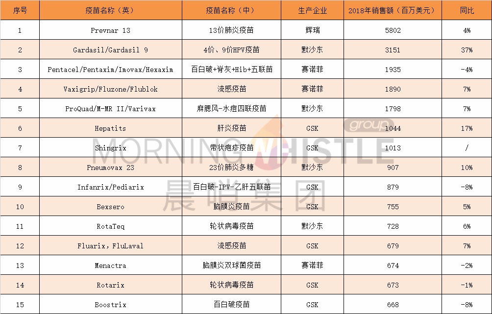 2018年全球销售TOP15重磅疫苗