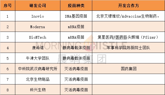 截至5月11日,世界卫生组织的官网上已经备案了110个正在研发的卫生事件疫苗,其中已进入临床试验的共有8个。晨哨并购整理如下,这8个已经进入临床试验的疫苗中,4个来自中国研发团队,3个来自美国,一个来自英国。