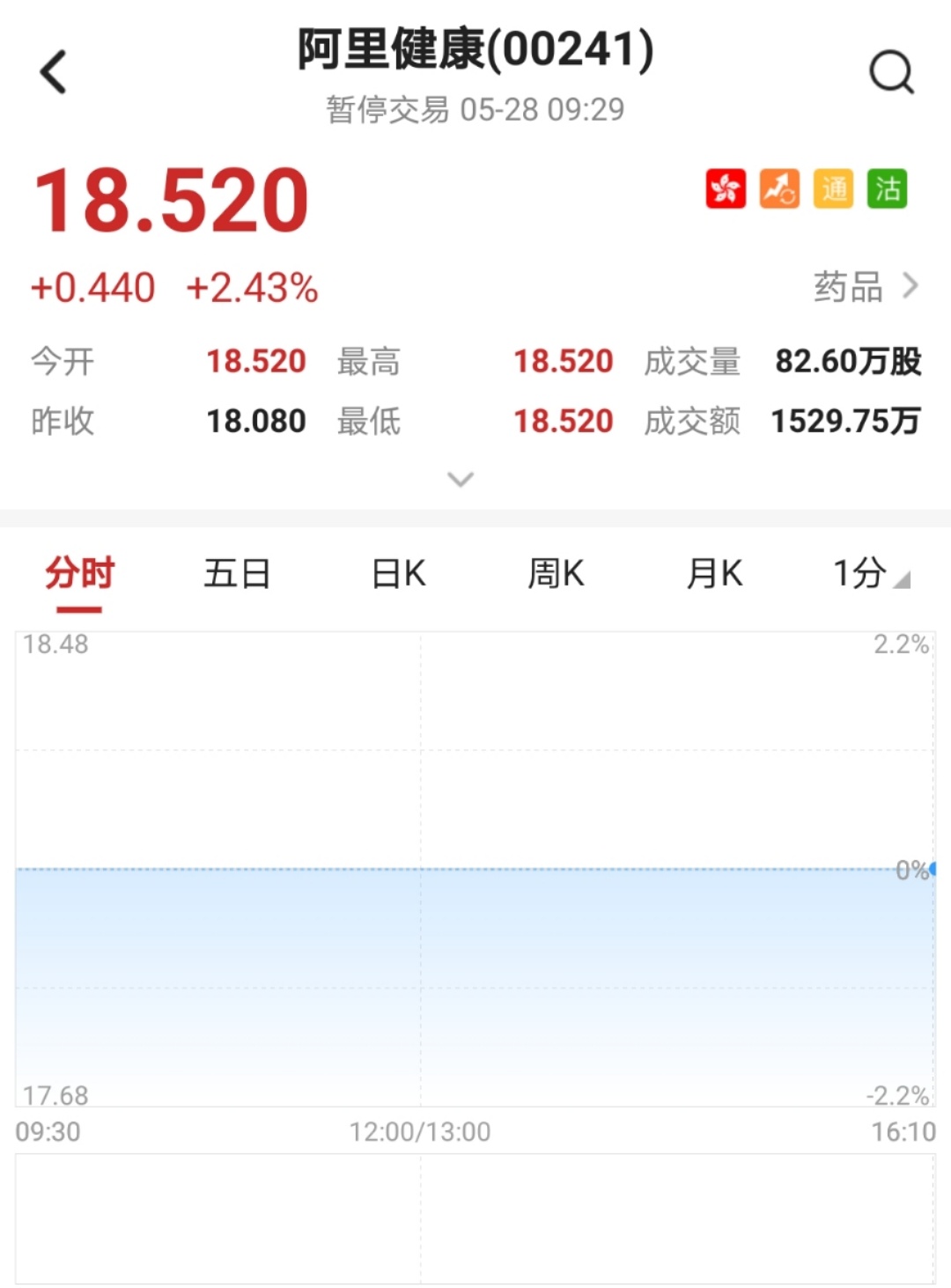 智通财经APP获悉,阿里健康(00241)发布公告,2020年财年营收同比增88.3%达95.97亿,亏损缩减82.9%至1570万元,净利润升114.8达2.61亿元。该股早盘高开2.43%,截至9时29分,涨2.43%,报价18.52港元,成交额1529.75万。