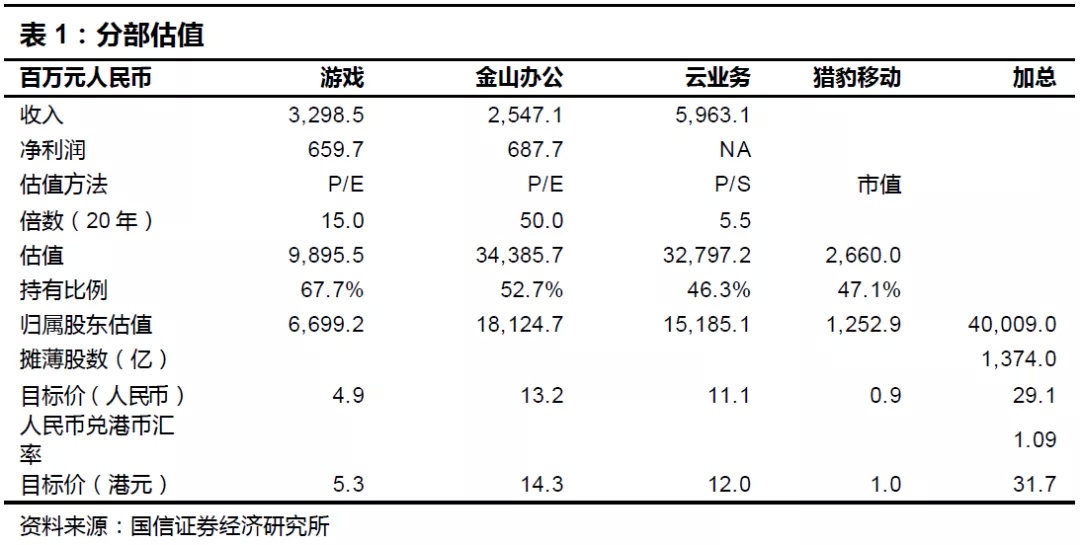 鉴于游戏业务PC端受到公共卫生事件催化取得良好业绩,且手游可期;办公软件获得了不菲的用户增长:我们以分部估值计算公司价值,分别给予游戏业务20年15倍PE(对应21年12倍),办公业务50倍PE(对应21年34倍PE),云业务5.5倍PS(对应21年4倍),得到公司合理估值约为30-32元,维持“买入”评级。
