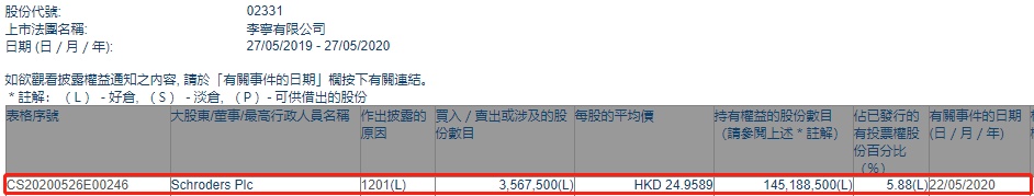 智通财经APP获悉,联交所最新资料显示,5月22日,Schroders Plc减持李宁(02331)356.75万股,每股作价24.9589港元,总金额约为8904.09万港元。智通财经APP获悉,减持后最新持股数目约为1.45亿股,最新持股比例为5.88%。