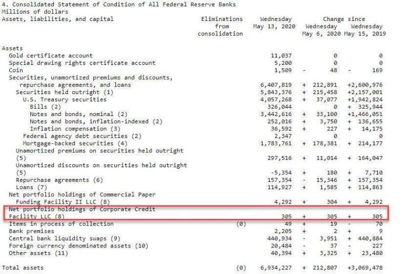 美联储从5月12日开始购买ETF。根据美联储5月14日披露的数据显示,截至5月13日,二级市场企业信贷便利(SMCCF)工具余额3.05亿美元,也就是说,其在启动企业债购买计划后的两天内,就买入了3.05亿美元ETF。整体来看,截至5月13日当周,美联储资产负债表规模达到了创纪录的6.93万亿美元,较前一周增加约2128亿美元。