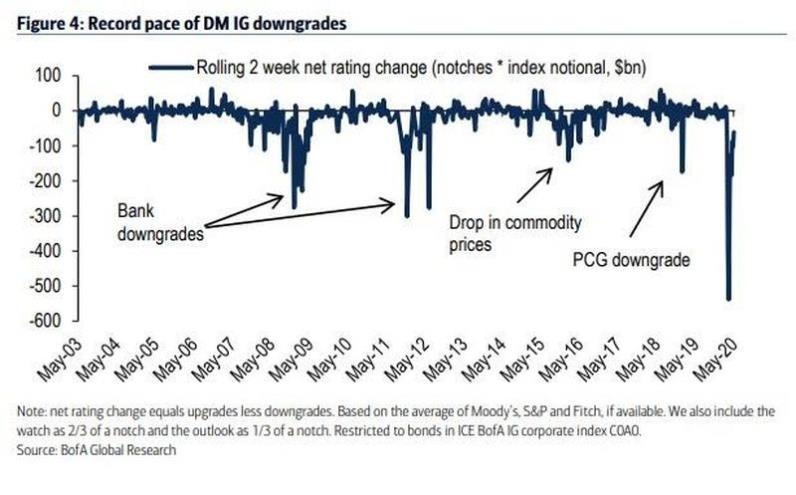 近日,评级被调降的债券数量飙升至空前的水平,如近日的Apache Corp和Service Properties Trust。自2月底以来,净降级(降级减升级)的投资级债券总量达1.126万亿美元。