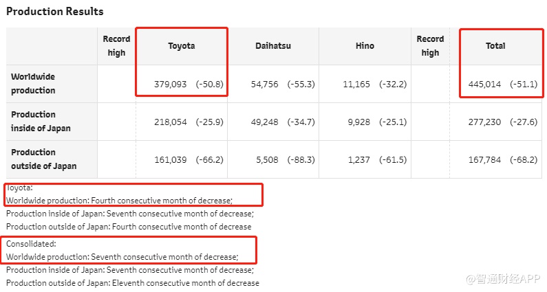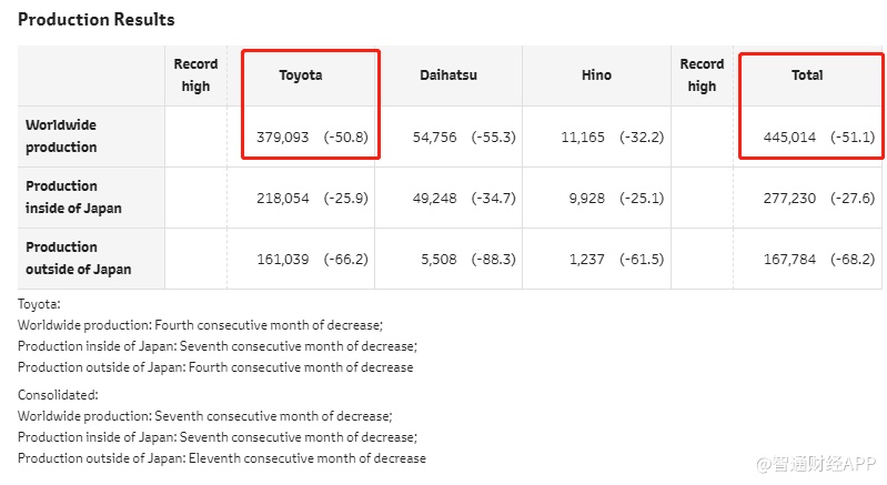 集团四月份全球总产量445,014辆,同比下降51.1%,为连续第7个月下降;其中,丰田四月产量379,093辆,同比降低50.8%,为连续第4个月下降。