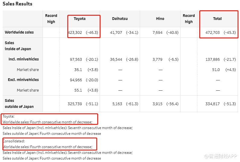 文件显示,丰田汽车总公司(包括丰田、大发、日野在内)今年四月份全球总销量为472,703辆,同比下降45.3%;其中,丰田销量为423,302辆,同比下降46.3%,两者均为连续第四个月下降。