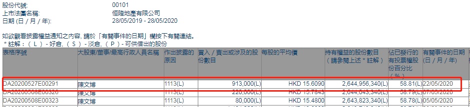 智通财经APP获悉,联交所最新资料显示,5月22日,执行董事陈文博增持恒隆地产(00101)91.3万股,每股作价15.609港元,总金额约为1425.10万港元。智通财经APP获悉,增持后最新持股数目约为26.45亿股,最新持股比例为58.81%。