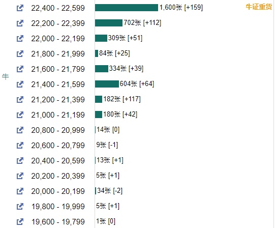 智通财经APP获悉,截至5月28日,恒指最新的牛熊街货比例28:72。摩根恒指牛熊证街货分布图中的数据显示,熊证街货重货区在23700-23899区间,该区间最新熊证数量为2422张,较上一交易日增加339张,最多新增区间在23900-24099区间,该区间最新熊证数量为2231张,新增405张。牛证街货重货区在22400-22599区间,该区间最新牛证数量为1600张,较上一交易日新增159张,最多新增也在该区间。