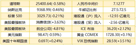 1、隔夜美股投资者继续关注经济活动重启,失业救济数据显示,卫生事件拖累经济下滑情况或已见底,大市辗转向上,尾段美股涨幅持续收窄,三大指数悉数转跌。截至收盘,标普500指数跌6.40点,跌幅0.21%,报3029.73点;纳指跌43.40点,跌幅0.46%,报9368.99点;道指跌147.60点,跌幅0.58%,报25400.64点。港股ADR指数全日走弱,按比例计算,收报22980点,跌151.94点或0.66%。