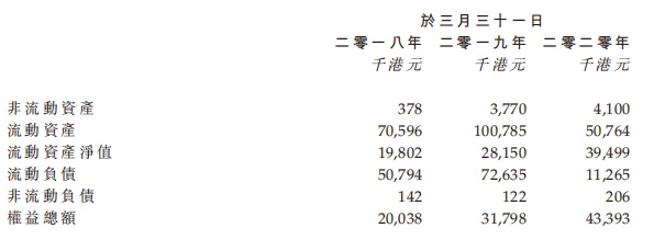 集团流动资产净值由2018年3月31日约1980.2万港元增加至于2019年3月31日约2815万港元。于2020年3月31日,流动资产净额进一步增加至3949.9万港元。