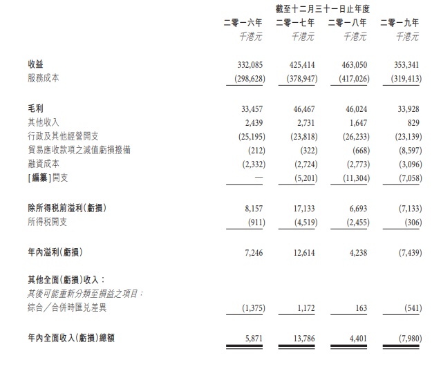 2016财政年度、2017财政年度、2018财政年度及2019财政年度,毛利分别为3345.7万港元、4646.7万港元、4602.4万港元及3392.8万港元,而该企业于相关年度毛利率均维持相对稳定,分别为10.1%、10.9%、9.9%及9.6%。