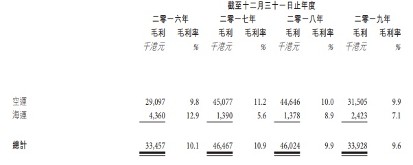 毛利率于往绩记录期间大幅波动,海运的毛利贡献仍维持相当低水平。海运分部毛利率由2016财政年度12.9%减少至2017财政年度的5.6%,主要由于厦门及天津办事处业务减少所致,而海运于2018财政年度毛利率则增加至8.9%,主要由于该企业主要海运客户中一名毛利率较低客户于2018财政年度不再合作所致。海运分部于2019财政年度毛利率轻微减少至7.1%,主要由于香港及上海办事处主要海运客户所贡献导致毛利率减少。