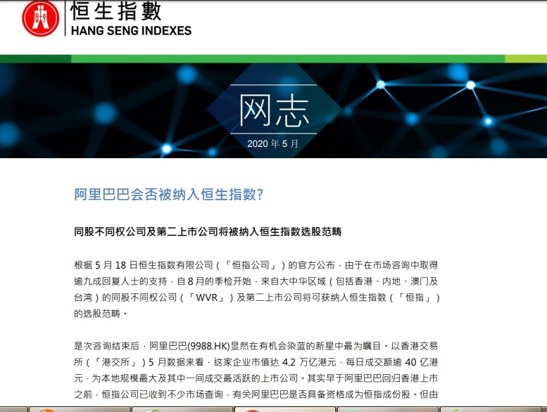 恒指公司表示,阿里巴巴最有机会被纳入。五月数据显示,阿里巴巴巿值达4.2万亿港元,每日成交额逾40亿港元,并称早于阿里巴巴回归香港第二上巿之前,已收到不少市场查询,问及阿里巴巴是否具备资格成为恒指成份股。